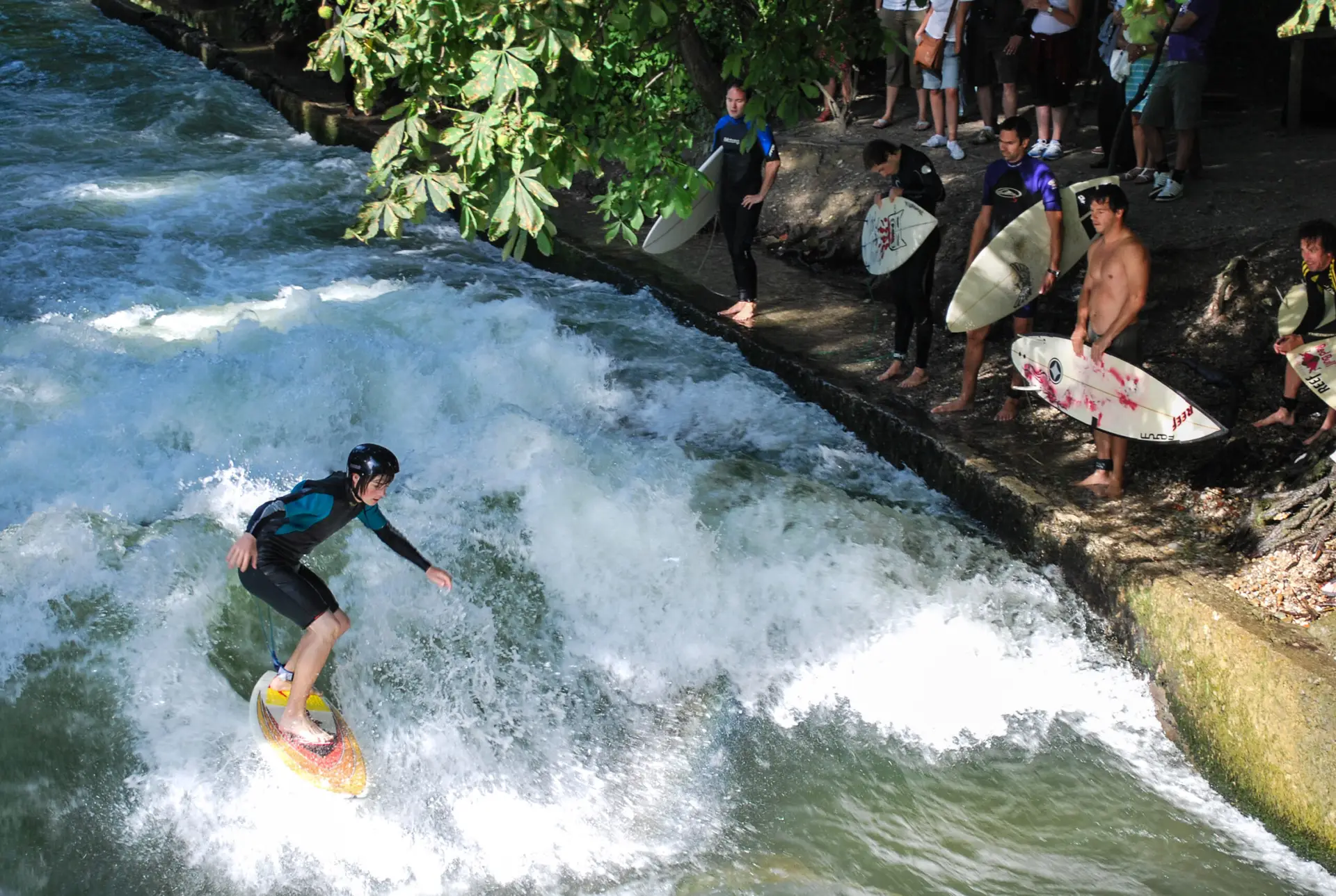Hidden in the heart of Munich’s Englischer Garten, there’s a place where adventure meets tradition — the Eisbachwelle. Here, surfers